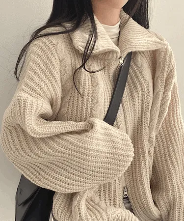 [국내!/퀄리티대박~!] 카라넥 / 하이넥 아방핏 벌룬 투웨이 꽈배기 니트 집업 5color